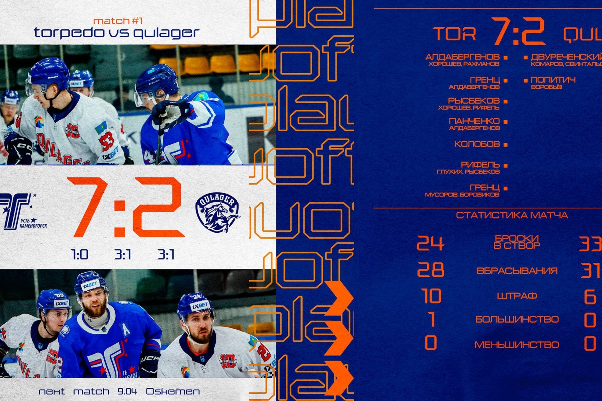 В первом периоде Эрик Алдабергенов выводит «Торпедо» вперед в ходе розыгрыша численного большинства – 1:0. Переломным стал стартовый отрезок второго периода. «Кулагер» допустил ряд ошибок в обороне, которыми торпедовцы умело воспользовались. Дмитрий Гренц убегает на рандеву с вратарем, и не сближаясь, отправляет шайбу в угол ворот – 2:0. Диас Рысбеков бросил с неудобной под перекладину после того, как шайба отскочила на «пятак» - 3:0. Затем Александр Панченко в касание бросает в ближнюю «девятку» после точной передачи Эрика Алдабергенова.